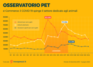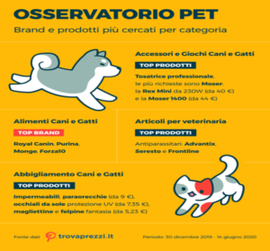 Il comparto di vendita di prodotti dedicati agli animali da compagnia in Italia non conosce crisi, ma segna numeri positivi e in crescita anno dopo anno. La vendita di Pet food e di accessori per animali ha generato nel 2019 un giro d’affari rispettivamente di 14,5 milioni e 144,3 milioni di Euro. (Fonte Rapporto Assalco-Zoomark 2020) Nemmeno l’emergenza da Covid-19 sembra aver frenato l’amore e la dedizione degli italiani nei confronti degli animali. Anzi, il lockdown ha contribuito a dare un’ulteriore spinta alla vendita dei prodotti specializzati tramite i canali online: è quanto emerge dall’ultimo Osservatorio Pet di Trovaprezzi.it che ha analizzato le ricerche sul web nel primo semestre del 2020.